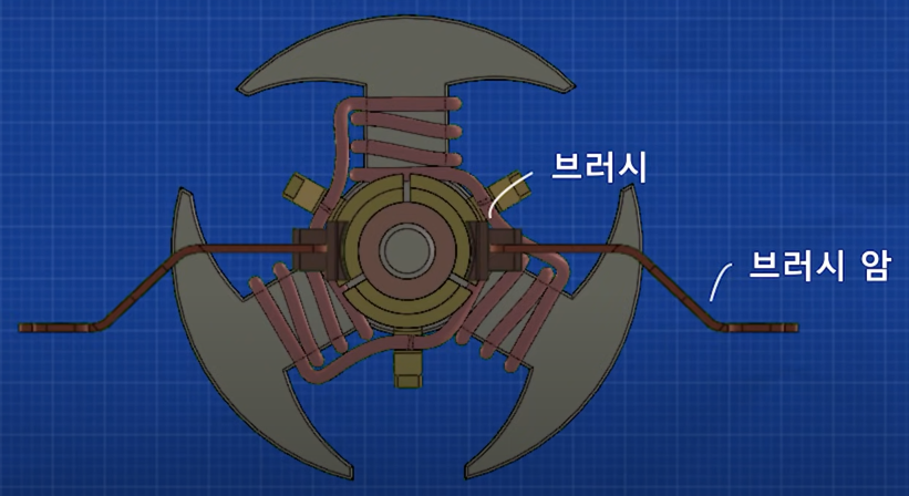 들어온 전기는 브러쉬를 통해 정류자에 전달하게 되고, 정류자와 접속된 코일에 전기를 전달하게 됩니다.