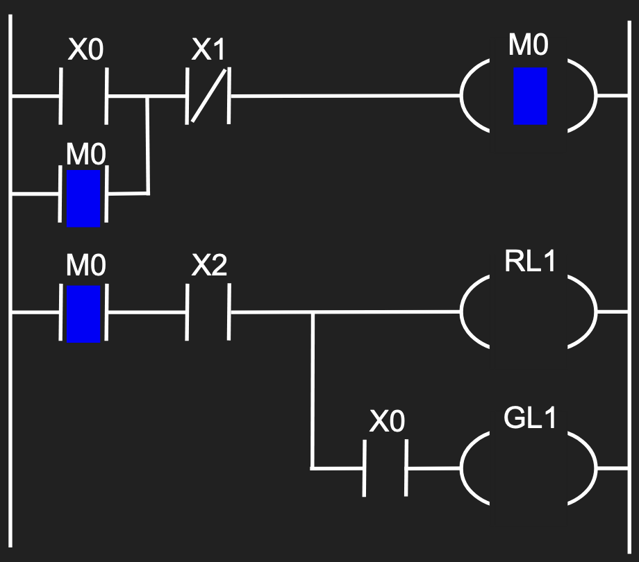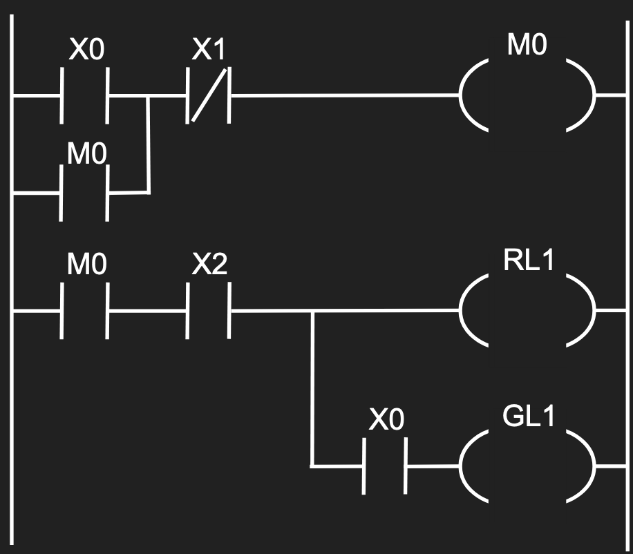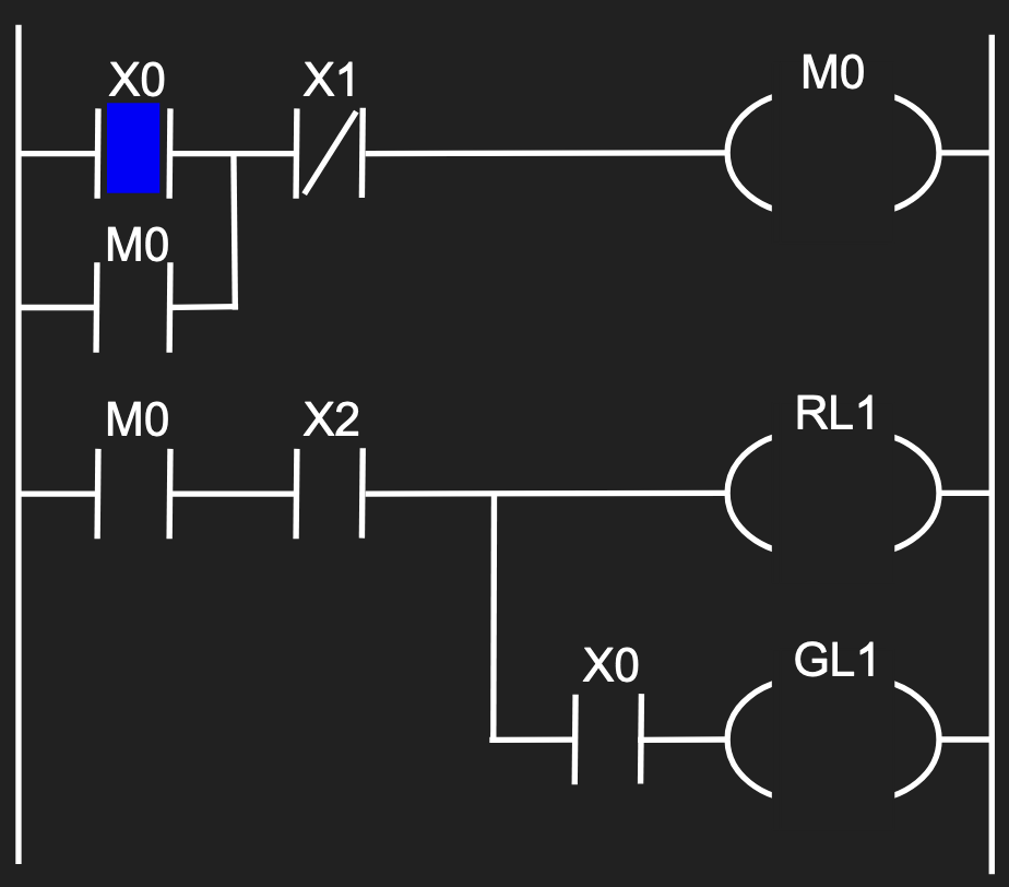 PLC의 Input에 X0, X1, X2를 연결했다, Output에는GL1(Green Lamp), RL1(Red Lamp)가 연결되어있다고 가정해보겠습니다.